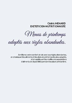 Cédric Menard: Cédric MENARD est diététicien-nutritionniste diplômé d'Etat français, exerçant depuis 2008 en profession libérale dans le département de la Manche. Cédric MENARD fait partie des très rares diététiciens-nutritionnistes de France à être diplômé du Collège Européen Nutrition Traitement Obésité (CENTO) en 2009, le spécialisant en micronutrition. La collection écrite par l'auteur "Savoir quoi manger, tout simplement..." représente pas moins d'une centaine d'ouvrages tous traitant de la diététique. Site Internet de l'auteur : www.cedricmenardnutritionniste.com