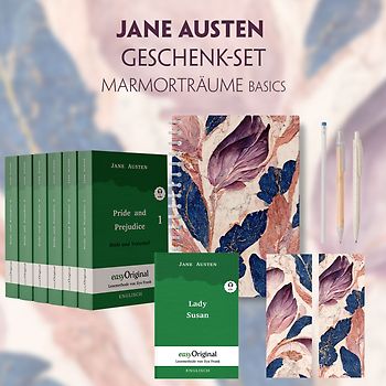 Jane Austen Geschenkset - 7 Bücher (Softcover + Audio-Online) + Marmorträume Schreibset Basics