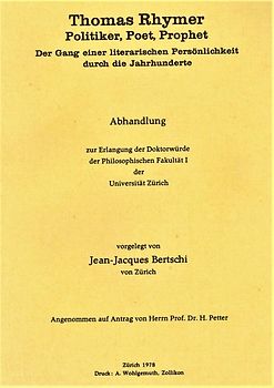 … Dr. Jean-Jacques Bertschi befasste sich als polyvalenter Student mit zahlreichen Kunstformen im deutschen wie im englischen Sprachraum. Schritt für Schritt erkannte er Parallelen und Zusammenhänge (europa-, ja weltweit) rund um die nicht allzu bekannte Legenden-Figur Thomas Reimer. Beeindruckend auch die Kraft der Märchenmotive und der tiefenpsychpologischen Elemente der Beziehung zwischen Mensch und Elfen. In diesem Sinne wird, interdisziplinär, die ganze Breite der philosophischen Fakultät ausgereizt. Neben der präzisen Verfolgung und Aufarbeitung der einzelnen Kunstwerke und Kunstformen (in den 70er Jahren!) überraschte den Autor die Vielfalt, aber mehr noch die Gemeinsamkeiten über viele Kulturkreise hinweg.
