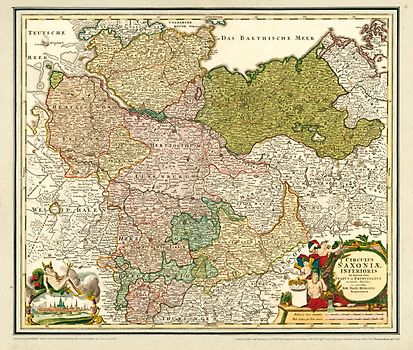 Historische Karte: Norddeutschland - mit den Herzogtümern Holstein, Mecklenburg, Lüneburg, Braunschweig, dem Herzogtum Magdeburg, der Grafschaft Dannenberg und dem Bistum Hildesheim, um 1720- (Plano). Kartuscheninschrift: Circulus Saxoniae Inferioris in omnes suos Status et Principatus accurate divisus. ex conatibus Ioh. Bapt. Homanni Noribergae.
