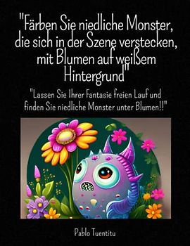 „Färben Sie niedliche Monster, die sich in der Szene verstecken, mit Blumen auf weißem Hintergrund“: „Lassen Sie Ihrer Fantasie freien Lauf und finden Sie niedliche Monster unter Blumen!“